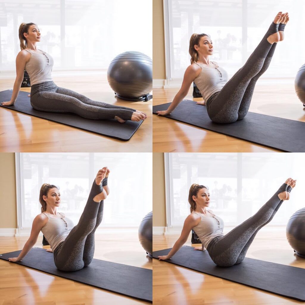 - Now bend your knees towards your chest and spread your legs up to 45 in Pilates stance.