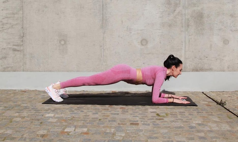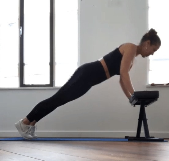 - Start in a plank position with your hands on the step, your shoulders on your wrist, and your body in a straight line.