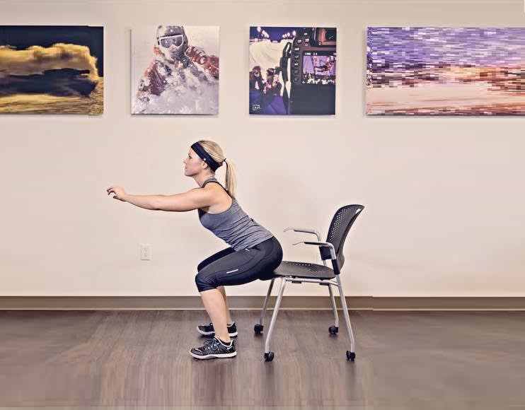 - Using your arms as a model, stretch out in front of you, and gently touch the seat with your hips, ensuring that your knees are directly tracking your toes and not knocking inward. Have been.