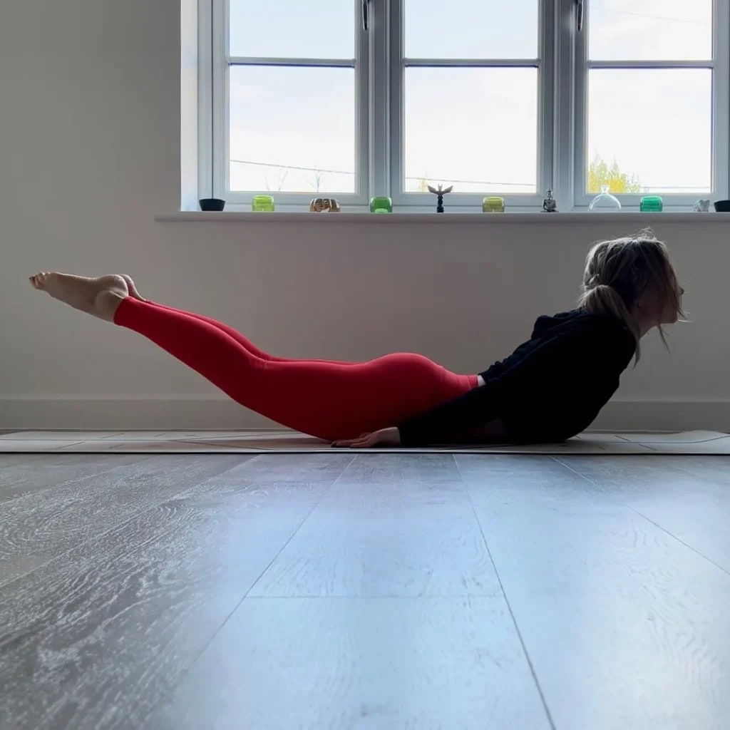 - Keeping the hands lightly on the mat, lift the head and chest and the legs up, leading the inner thighs.