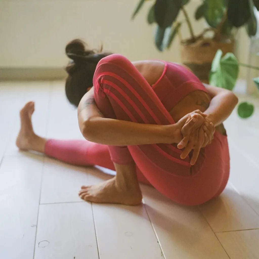 The Revolved Head to Knee pose stretches the spine, shoulders, and hamstrings. It stimulates the abdominal organs, such as the liver and kidneys, and improves overall digestion.