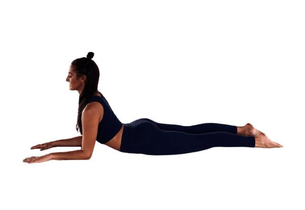 - Inhale, raise your hips and abdomen above the ground and slid your hands underneath your hips. Lower the hips on top of your hands, and press into the elbows, shoulder blades up and lift the chest up.